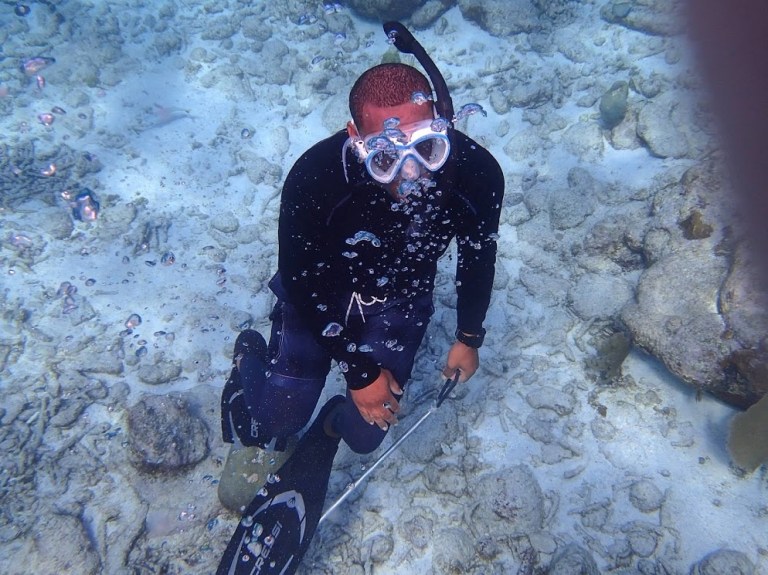 Each of our guides had a different area of expertise. We were led by knowledgeable guides on snorkeling trips throughout the reef. Here, a guide dives to the bottom of the reef with a pointer, searching for underwater life to point out to snorkelers above.